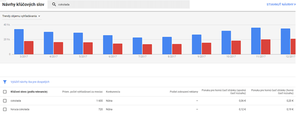 Ukáže vám navrhovaný bid, rovnako ako priemerné mesačné vyhľadávania. Pri vytváraní predstavy, ako populárne konkrétne kľúčové slovo je (koľko naň biduje konkurencia), majte však na pamäti, že tieto dáta nie sú vždy presné. Väčšinou sa tento nástroj používa len ako doplnkový pri tvorbe kampaní.