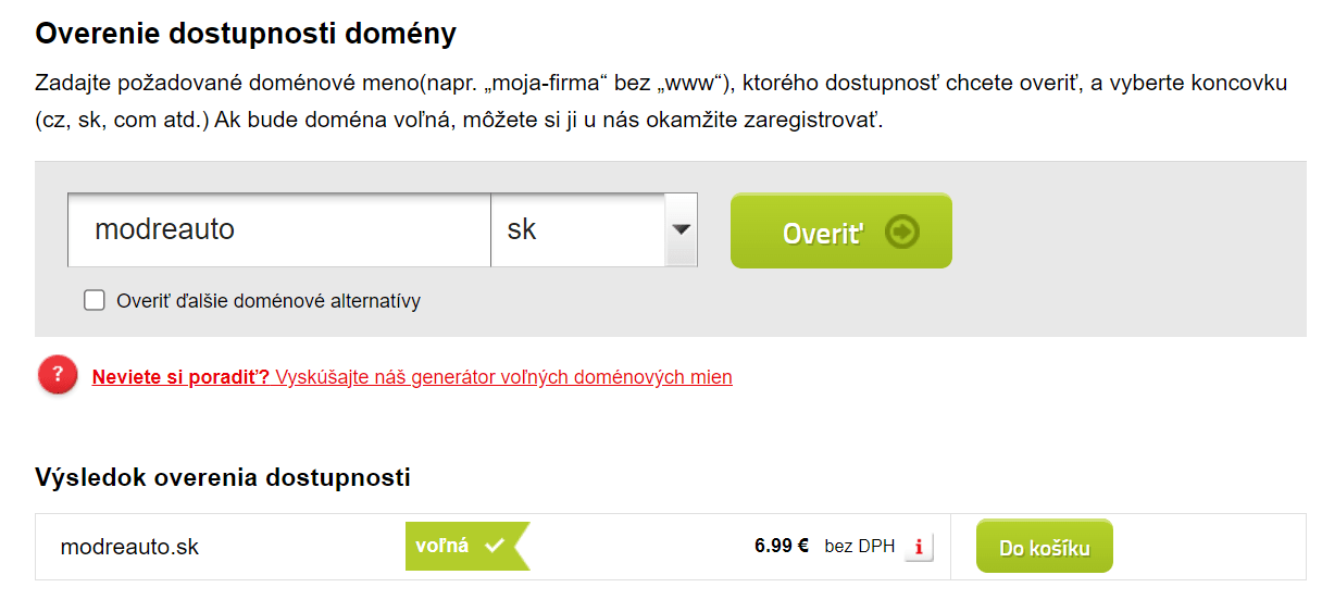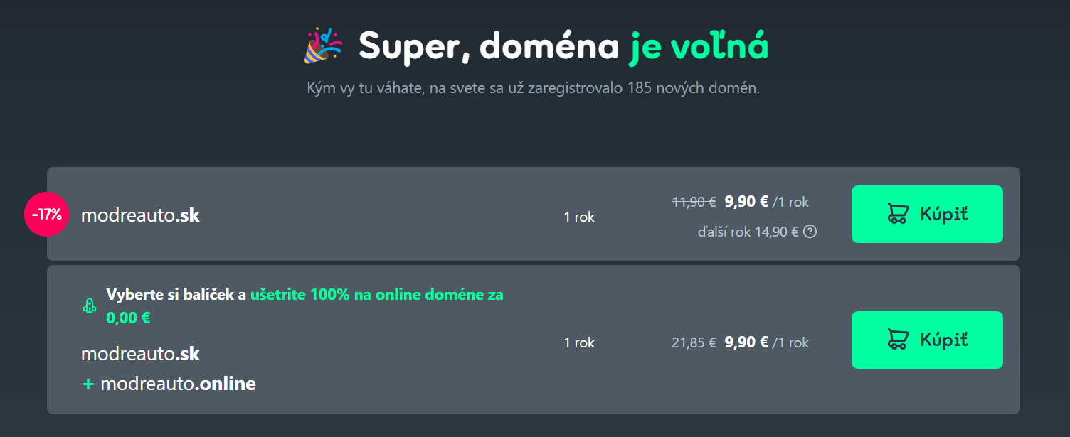 V prípade, že je doména voľná, môžete ju rovno zaregistrovať.