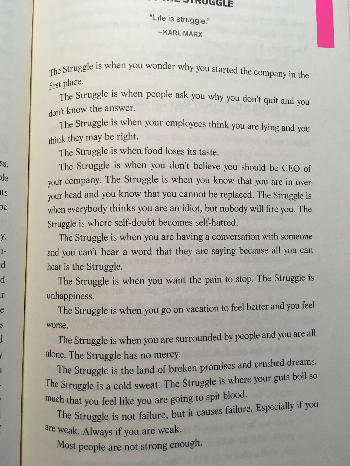 Ako by povedala kolegyňa Eva: „Raz sme hore, raz sme dole”. Celú firmu, alebo jej časť, som riadila 5 rokov a úplne chápem, že niekedy ste dole a niekedy tam ostanete aj celkom dlho. Avšak ten, kto vlastní alebo vedie firmu sa v tomto utrpení istým spôsobom vyžíva. Je to taká zvláštna úchylka ľudí na vedúcich pozíciách. A ja ňou „trpím” tiež. 😉 Najviac to vystihuje táto strana z knihy „The hard thing about hard things”.