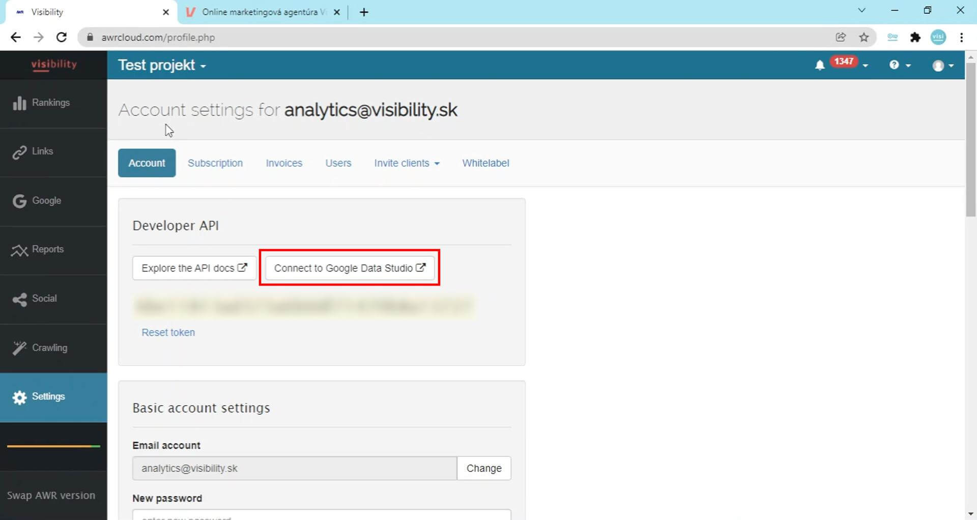 3. V sekcii Account settings, v časti Developer API, klikneme na tlačidlo Connect to Google Data Studio (môžete si už dopredu skopírovať API key, ktorý využijeme v ďalšom kroku):Prepojenie Data Studia a AWR