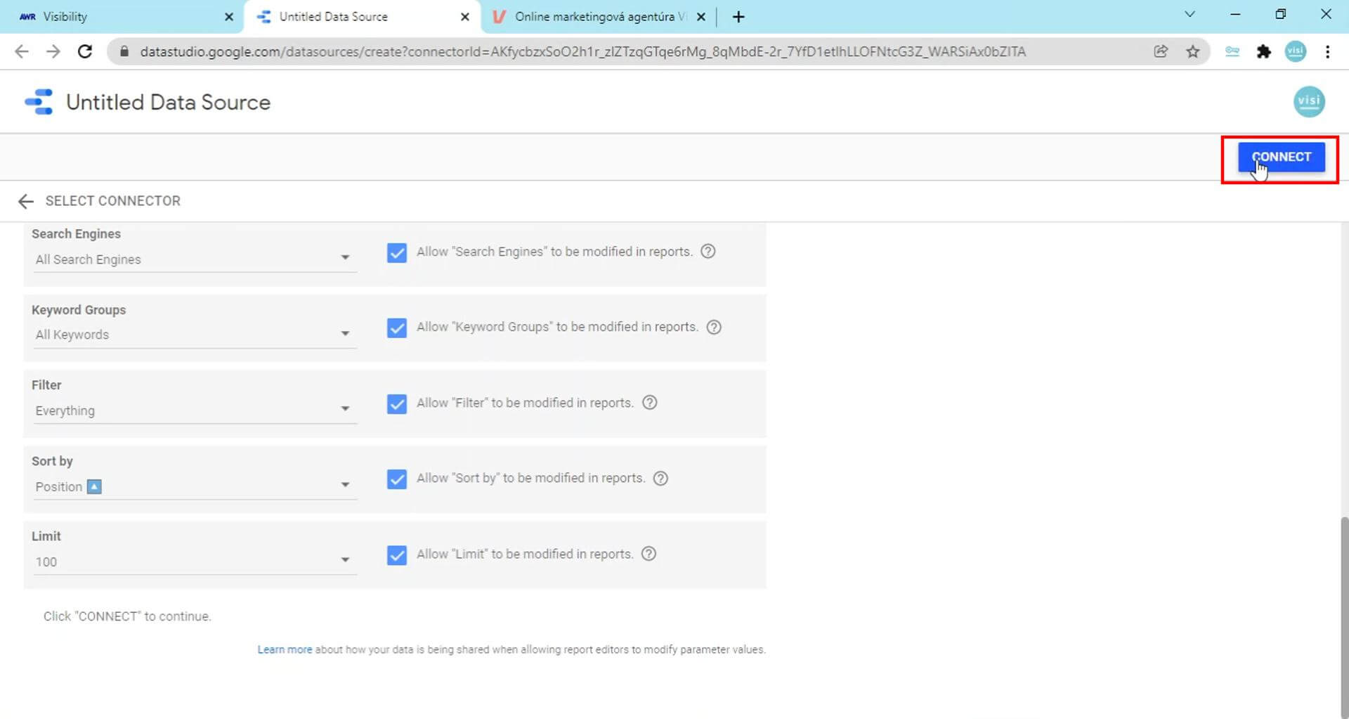 11. Ak máte v AWR rozdelené kľúčové slová do samostatných group, viete si v Data Studiu následne vyberať, ktorú skupinu chcete zobraziť. Vyberieme „All Keywords“ a zaškrtneme „Allow “Keyword Groups” to be modified in reports“.