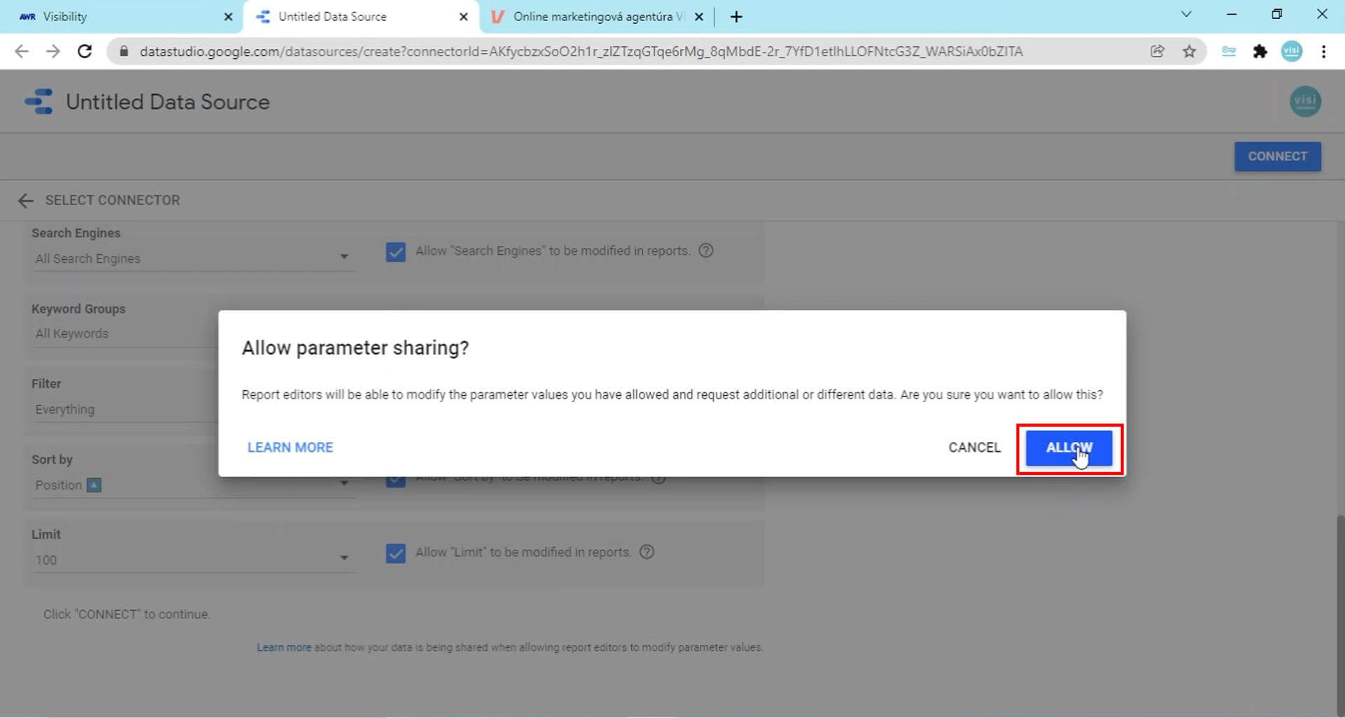 16. V prípade, že vám vyskočí pop-up okno na potvrdenie zdieľania parametrov „Allow parameter sharing“, kliknite na „Allow“:Prepojenie Data Studia a AWR