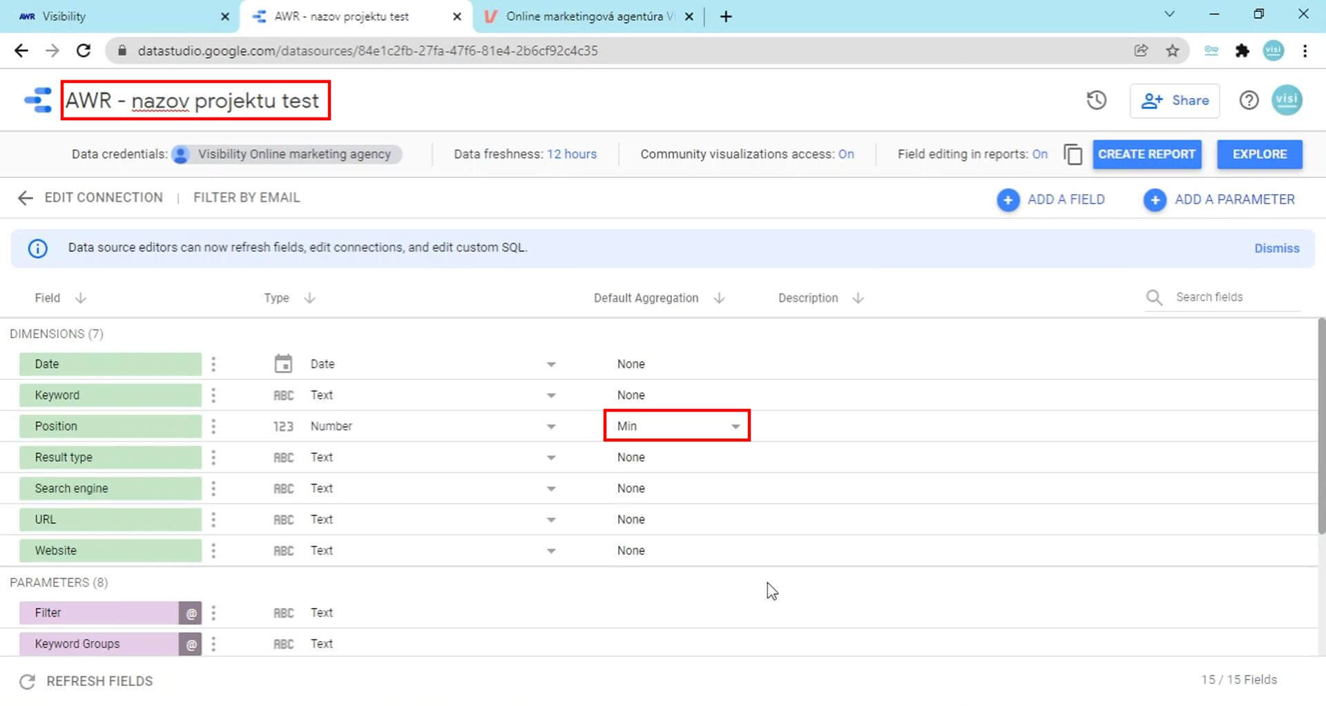 18. Posledným krokom je zmena v rámci riadku „Position“ a stĺpca „Default Aggregation“, kde zmeníme „Average“ na „Min“:Prepojenie Data Studia a AWR