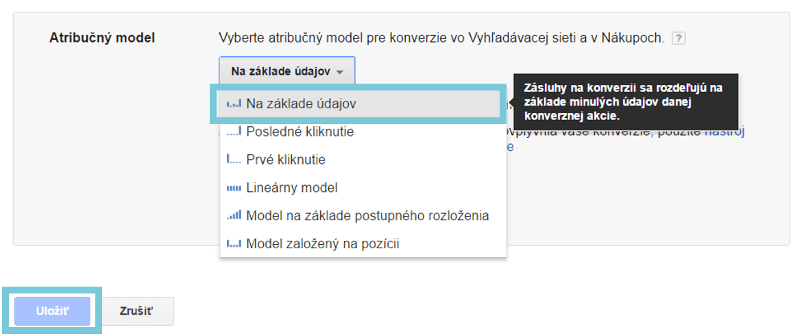 AI sa do toho zamieša, ak dosahujete väčšie množstvo konverzií (viac ako 14 denne). V takom prípade nám v nastaveniach konverzie pribudne nový atribučný model „Na základe údajov“, ktorý rozrátava konverziu a jej hodnotu medzi entity reklamného účtu podľa pravdepodobnosti ich významu (dôležitosti) v nákupnej ceste. Následne lepšie vidíme skutočne dôležité zložky kampaní, ktoré majú zásadný vplyv na konverzie a otvárajú sa tak dvere ku kvalitnejšej optimalizácii kampaní.