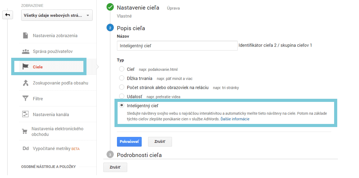 Pre weby, kde sa nedajú jednoznačne určiť či merať konverzie, pripravil Google zaujímavú funkcionalitu v nástroji Google Analytics. Ide o inteligentné ciele, kedy AI určuje, či ide o cennú návštevu alebo nie. Určuje to na základe množstva indikátorov užívateľského správania na webe (napr.: Trvanie relácie, Počet stránok na reláciu, Poloha, Zariadenie a Prehliadač), ktoré porovnáva medzi návštevníkmi na webe. Na základe toho určí najkvalitnejšie návštevy a priradí im konverziu, tzv. inteligentný cieľ. Ak máte účet AdWords prepojený s Analytics, tak si takýto cieľ viete importovať do rozhrania AdWords a s jeho pomocou optimalizovať a vyhodnocovať také druhy kampaní, kde by to bez tohto nebolo možné.