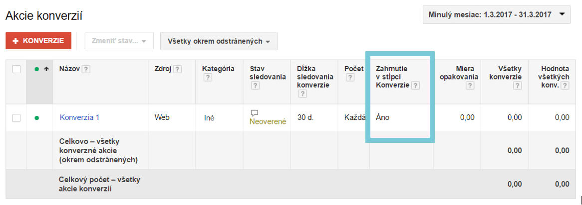 Ak máte v účte nastavených viacero konverzií, tak systém za tie smerodajné bude považovať konverzie, ktoré sú zaradené v stĺpci konverzie. Tie, ktoré nechcete, aby systém pri automatizovanej stratégii bral do úvahy, len nezaraďte do stĺpca konverzie podľa obrázku nižšie. Merať ich budete aj naďalej, no zaratúvať sa budú do stĺpca všetky konverzie (all conversions).