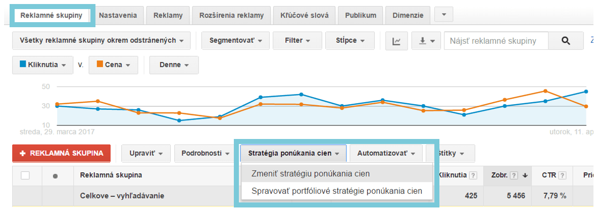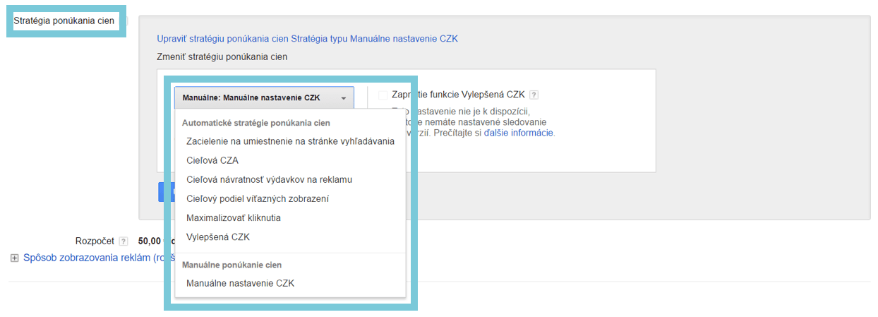 Stratégie je možné nastaviť aj na úrovni reklamných skupín, nielen kampaní. V takom prípade je nutné mať v kampani nastavené „Manuálne ponúkanie cien bez Vylepšenej CZK“ a následne meniť stratégie na úrovni reklamných skupín.