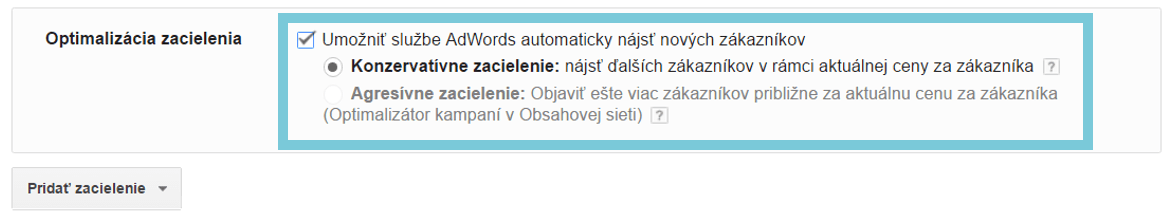 Po nazbieraní konverzií máme v rámci reklamných skupín možnosť zapnúť aj agresívne cielenie. To znamená, že systém rozšíri cielenie ešte viac na ľudí, pri ktorých je pravdepodobnosť konverzie za podobnú CZA, ako sa dosahuje. No odchýlka takto dosiahnutej CZA môže byť vyššia ako v prípade konzervatívneho cielenia. Odporúčam zapnúť v prípade, ak je dôležitejšie množstvo konverzií a nie je striktne stanovená CZA.