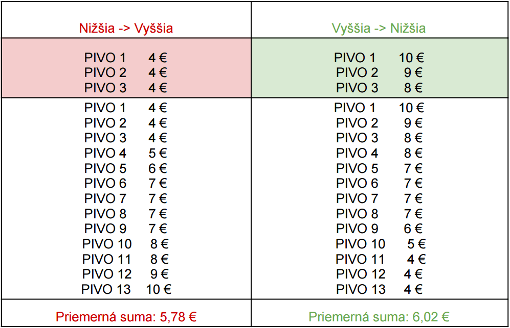 Ako je v tabuľke vyššie pekne vidieť, naľavo sa nám finančná referencia vytvára z čísel 4, 4 a 4 a naopak napravo sú to sumy 10, 9 a 8. Naľavo máme pocit, že čím ideme ďalej od začiatku, tým viac musíme platiť, napravo je to o tom, že čím sme ďalej od začiatku zoznamu, tým klesá kvalita.