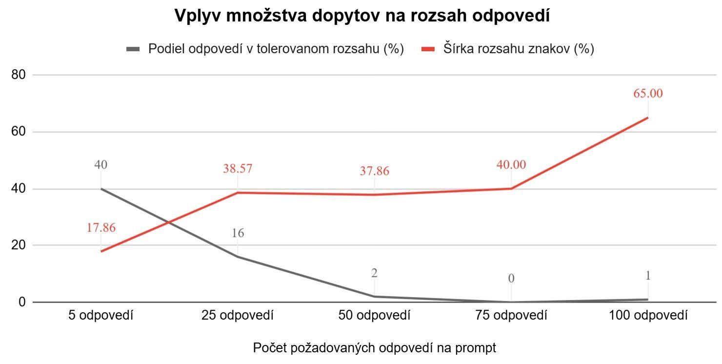 Ako vidieť na grafe, odchýlka bola najvýraznejšia pri jednorázovom požiadaní o 100 odpovedí, kde šírka rozsahu znakov dosahuje maximum a podiel odpovedí v tolerovanom rozsahu zostáva takmer nulový.