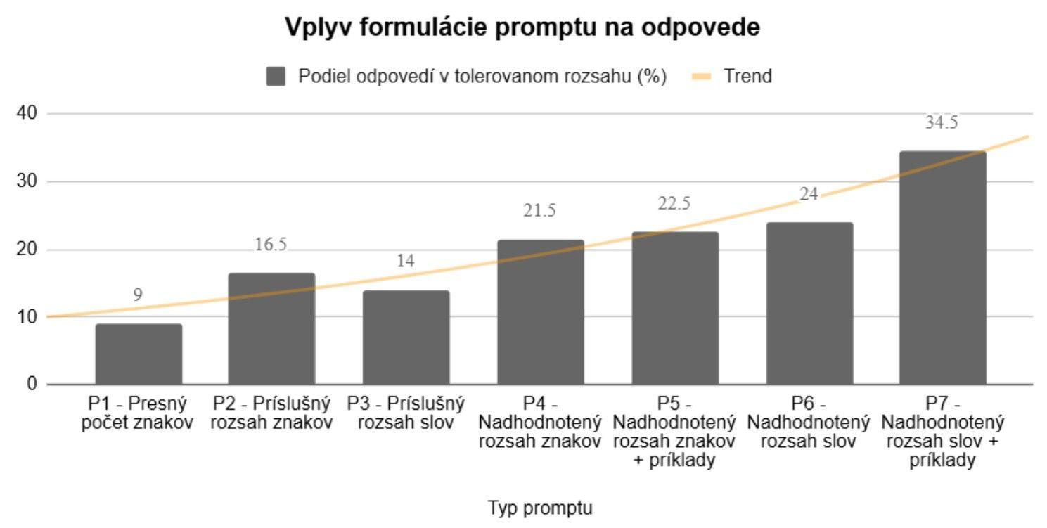 Graf 1: Porovnanie štýlu zadania promptu a trend odpovedí v tolerovanom rozsahu (zdroj: vlastné spracovanie)