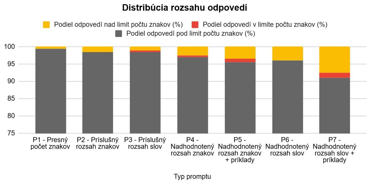 V prvej analýze sme vykonali test siedmich typov promptov, každý na vzorke 200 odpovedí (celkovo 1400 odpovedí). Chceli sme zistiť, ako dobre model (GPT-4o) dodržiava stanovený rozsah generovaných textov a aké metódy tvorby promptov dosahujú najvyššiu účinnosť.