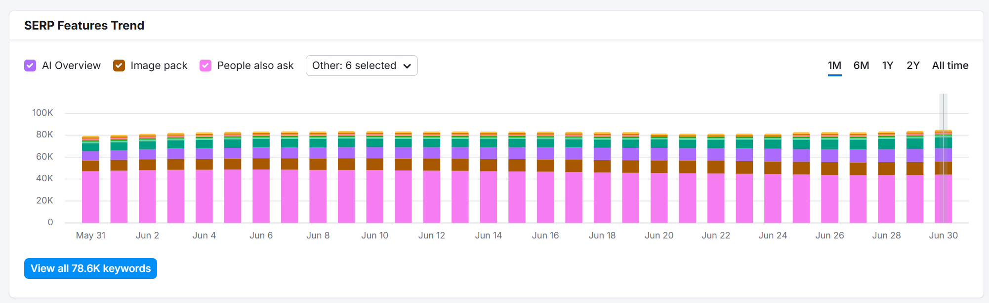 Stačí vložiť svoju webstránku alebo priameho konkurenta a vidíte, ako veľmi sa na jeho kľúčové slová AI Overviews zobrazuje a ako sa na tento dataset vyvíja zastúpenie v čase.